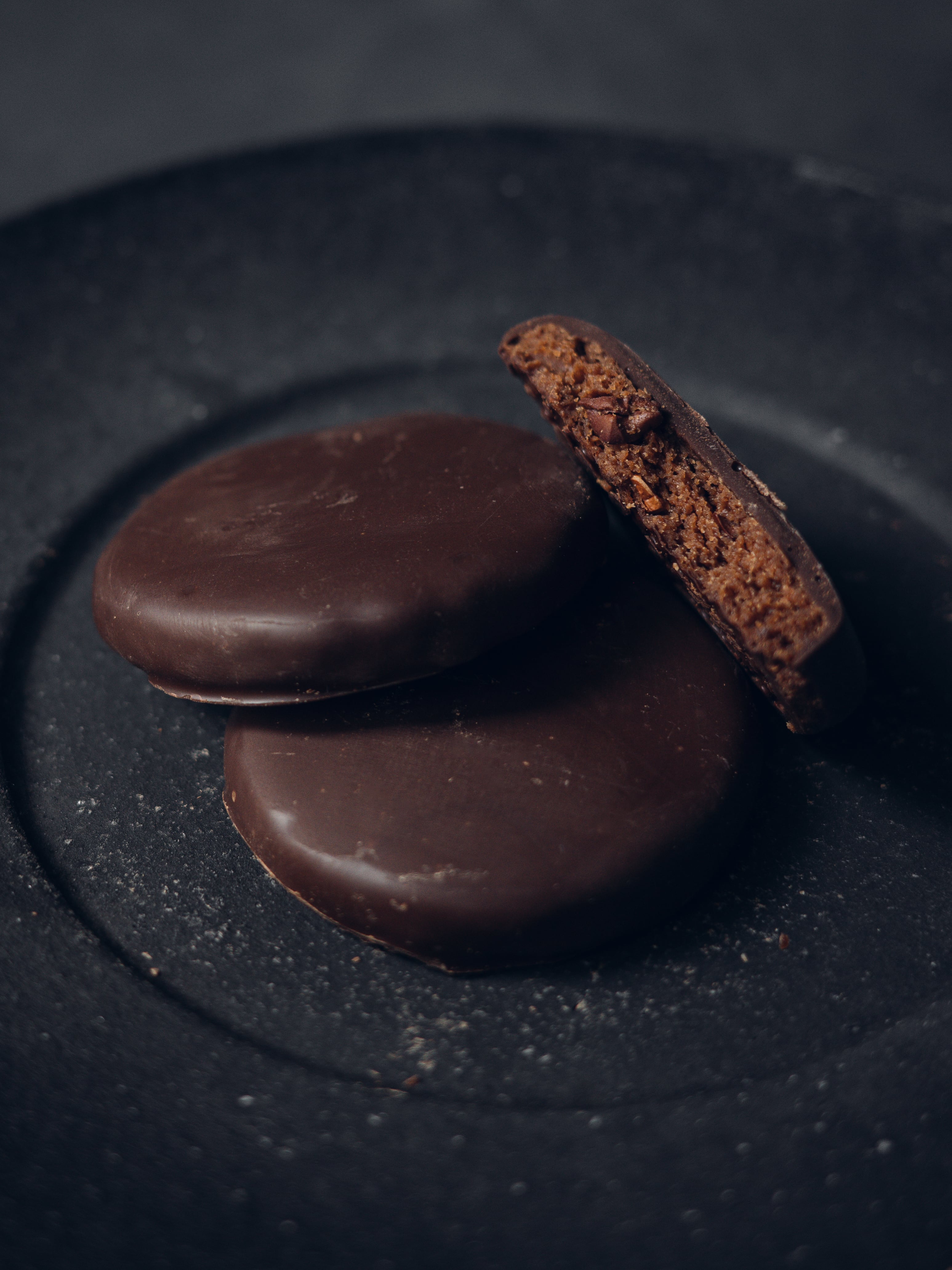 サブレの中にはカカオニブをたっぷりいれてカカオ本来の酸味や香り、カカオそのものが感じられるようなサブレ。ザクザクのサブレ、カカオニブ、コーティングのショコラと様々な食感、香りを楽しめる。RAW(生)ココアパウダーとカカオの果肉を使用したサブレ生地は通常のココア生地とは違う芳醇な味わい。