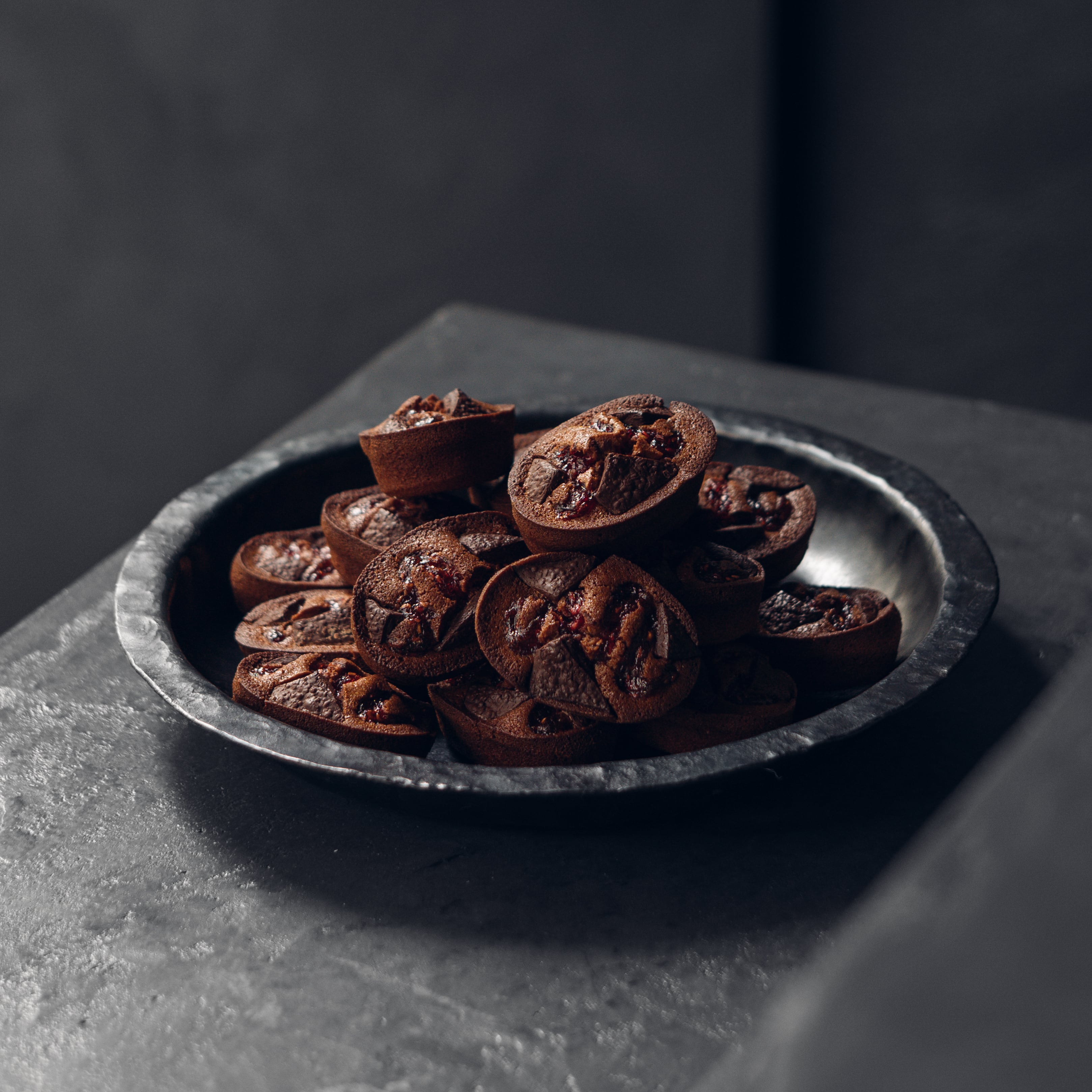 PACARI社のRAW(生)ココアを使用したセイロンシナモン香るフィナンシェにカカオハンターズのチョコとフランボワーズのコンフィチュールを絞った豪華なフィナンシェショコラ。